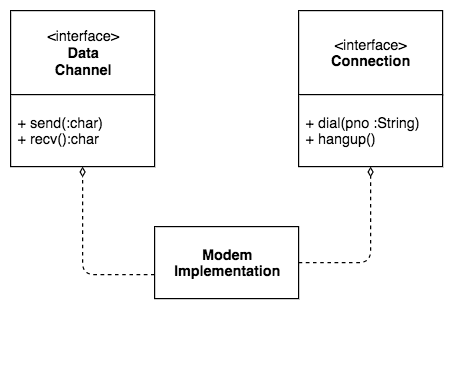 这种问题的解决方法就是通过接口进行方法隔离,Modem类实现两个接口,DataChannel接口和Connection接口。