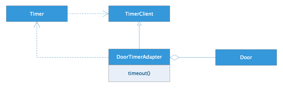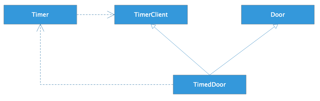 这个方法简单直接,也能实现需求,但是问题在于使Door多了一个timeout()方法。如果这个Door类想要复用到其他地方,那么所有使用Door的程序都不得不依赖一个它们可能根本用不着的方法。同时,Door的职责也变得复杂,违反了单一职责原则,维护会变得更加困难。这样的设计显然是有问题的。