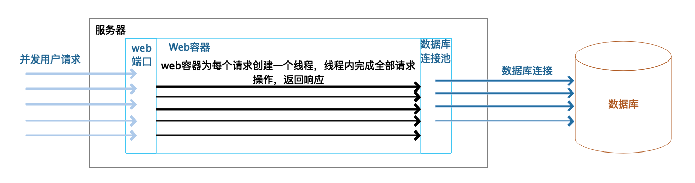 这是传统的Web应用程序运行期的线程特性。对于一个高并发的应用系统来说,总是同时有很多个用户请求到达系统的Web容器。Web容器为每个请求分配一个线程进行处理,线程在处理过程中,如果遇到访问数据库或者远程服务等操作,就会进入阻塞状态,这个时候,如果数据库或者远程服务响应延迟,就会出现程序内的线程无法释放的情况,而外部的请求不断进来,导致计算机资源被快速消耗,最终程序崩溃。