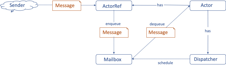 也就是说一个Actor向另一个Actor发送消息的时候,不需要另一个Actor去真正地处理这个消息,只需要将消息发送到目标Actor的Mailbox里面就可以了。自己不会被阻塞,可以继续执行自己的操作,而目标Actor检查自己的Mailbox中是否有消息,如果有消息,Actor则会在从Mailbox里面去获取消息,对消息进行异步的处理,而所有的Actor会共享线程,这些线程不会有任何的阻塞。