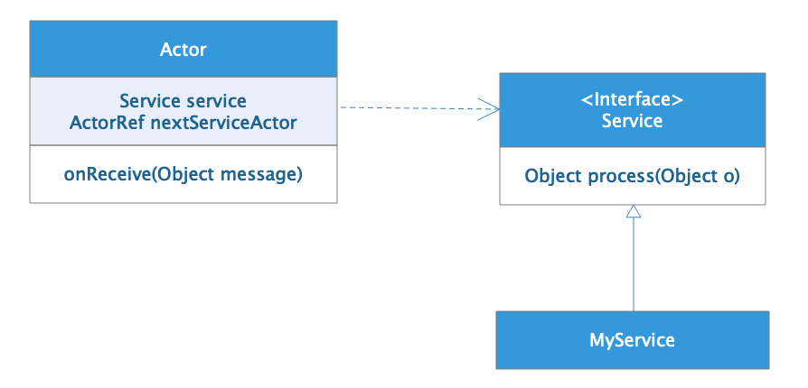 process处理完成后,返回一个Object对象。Actor会根据编排好的流程,获取MyService在流程中的下一个Service对应的Actor,即nextServiceActor,将process返回的Object对象当做消息发送给这个nextServiceActor。这样,Service之间就根据编排好的流程,异步、无阻塞地调用执行起来了。