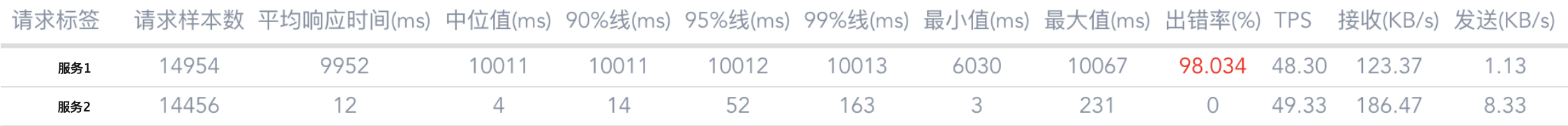 使用Flower开发的网关,实际压测效果如下,同样服务1响应延迟,出错率极高的情况下,通过Flower网关调用服务2完全不受影响。