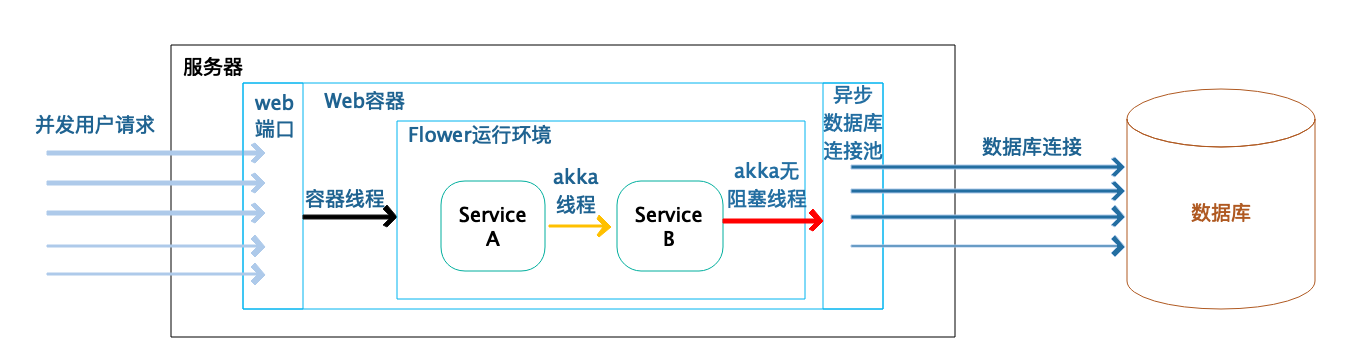 Flower框架实现异步无阻塞,一方面是利用了Web容器的异步特性,主要是Servlet3.0以后提供的AsyncContext,快速释放容器线程;另一方面是利用了异步的数据库驱动以及异步的网络通信,主要是HttpAsyncClient等异步通信组件。而Flower框架内,核心的应用代码之间的异步无阻塞调用,则是利用了Akka 的Actor模型实现。
