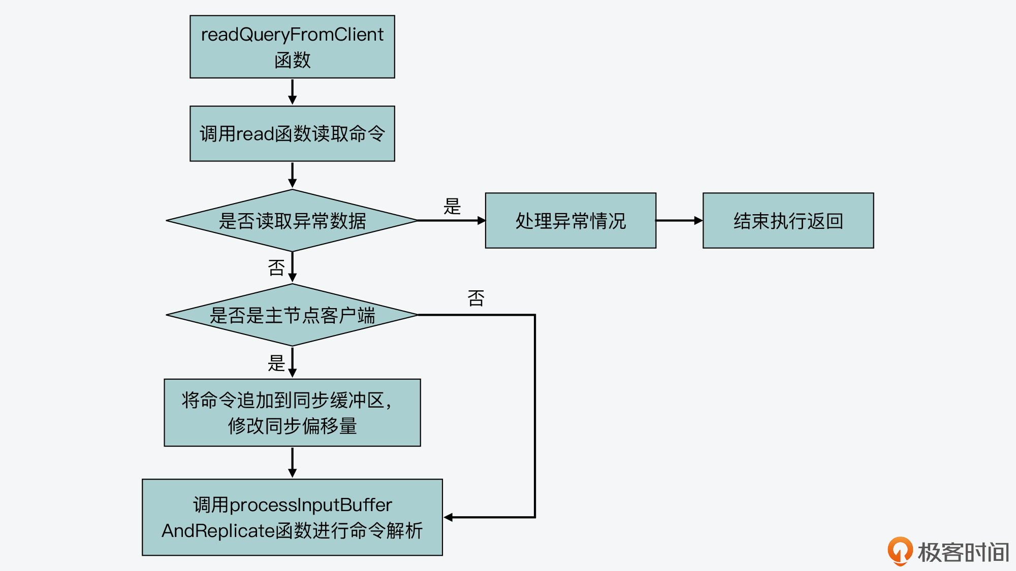 紧接着,readQueryFromClient函数会根据读取数据的情况,进行一些异常处理,比如数据读取失败或是客户端连接关闭等。此外,如果当前客户端是主从复制中的主节点,readQueryFromClient函数还会把读取的数据,追加到用于主从节点命令同步的缓冲区中。