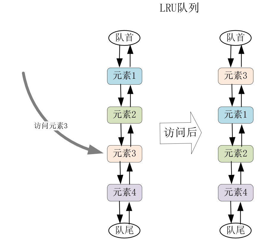 其次,LRU(Less Recently Used)也是最常用的淘汰算法,比如Redis服务就通过它来淘汰数据,OpenResty在进程间共享数据的shared_dict在达到共享内存最大值后,也会通过LRU算法淘汰数据。LRU通常使用双向队列实现(时间复杂度为O(1)),队首是最近访问的元素,队尾就是最少访问、即将淘汰的元素。当访问了队列中某个元素时,可以将其移动到队首。当缓存溢出需要淘汰元素时,直接删除队尾元素,如下所示: