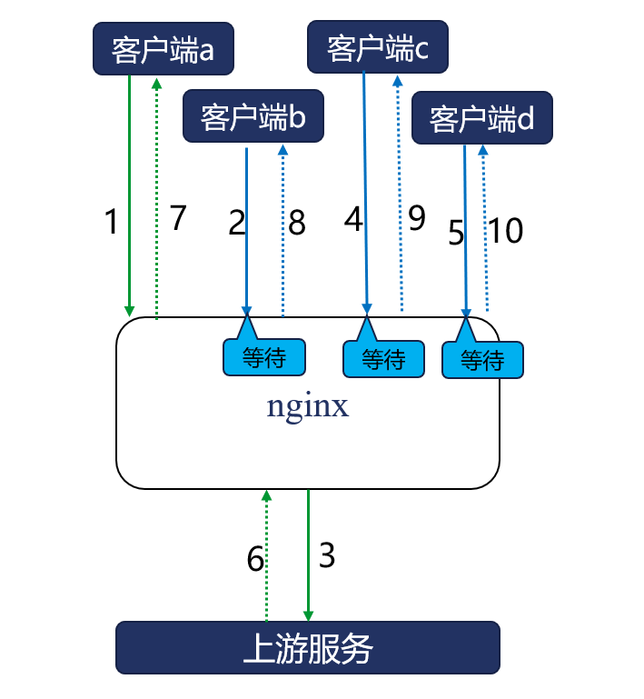 当热点缓存淘汰后,大量的并发请求会同时回源上游应用,其实这是不必要的。比如下图中Nginx的合并回源功能开启后,Nginx会将多个并发请求合并为1条回源请求,并锁住所有的客户端请求,直到回源请求返回后,才会更新缓存,同时向所有客户端返回响应。由于Nginx可以支持C10M级别的并发连接,因此可以很轻松地锁住这些并发请求,降低应用服务的负载。