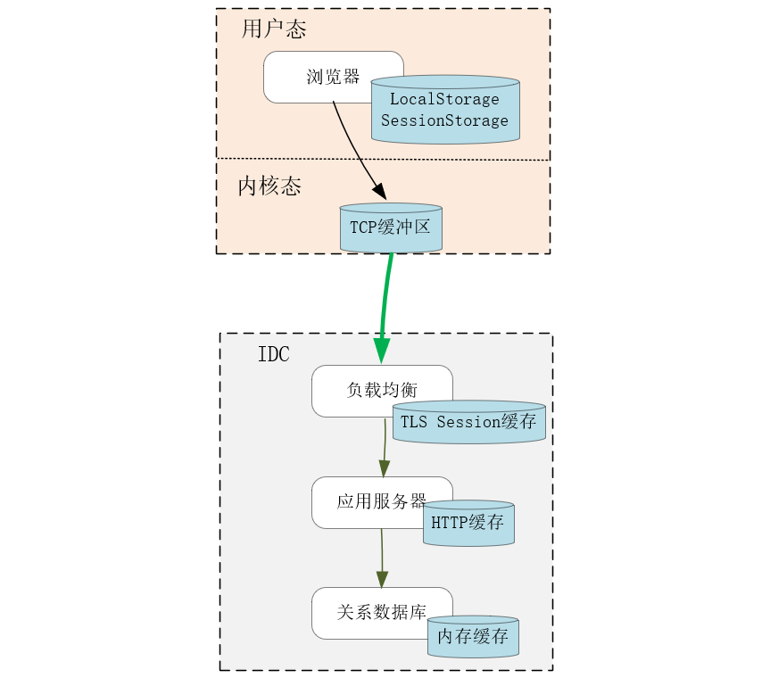 再比如下图的Web场景中,浏览器的本地缓存、操作系统内核中的TCP缓冲区(参见[[第11讲]])、负载均衡中的TLS握手缓存、应用服务中的HTTP响应缓存、MySQL中的查询缓存等,每一级缓存都缓解了上下游间不均衡的访问速度,通过缩短访问路径降低了请求时延,通过异步访问、批量处理提升了系统效率。当然,缓存使用了简单的Key/Value结构,因此可以用哈希表、查找树等容器做索引,这也提升了访问速度。