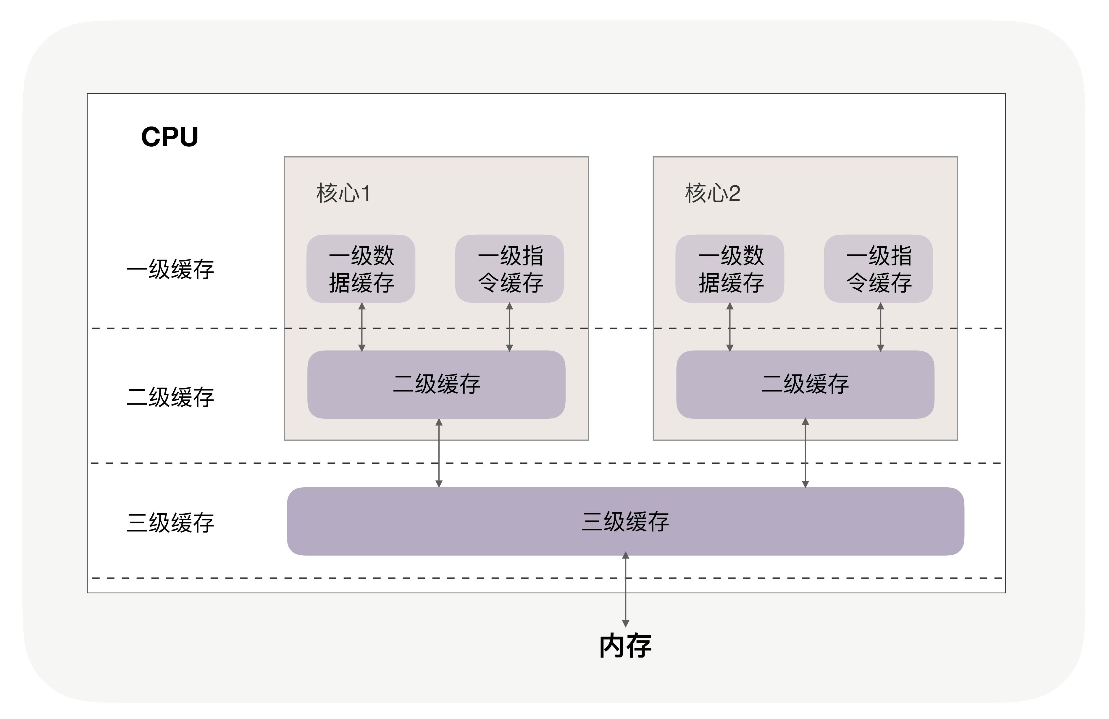 如果两个实体之间的访问时延差距过大,还可以通过多级缓存,逐级降低访问速度差,提升整体性能。比如[[第1讲]] 我们介绍过CPU三级缓存,每级缓存越靠近CPU速度越快,容量也越小,以此缓解CPU频率与主存的速度差,提升CPU的运行效率。