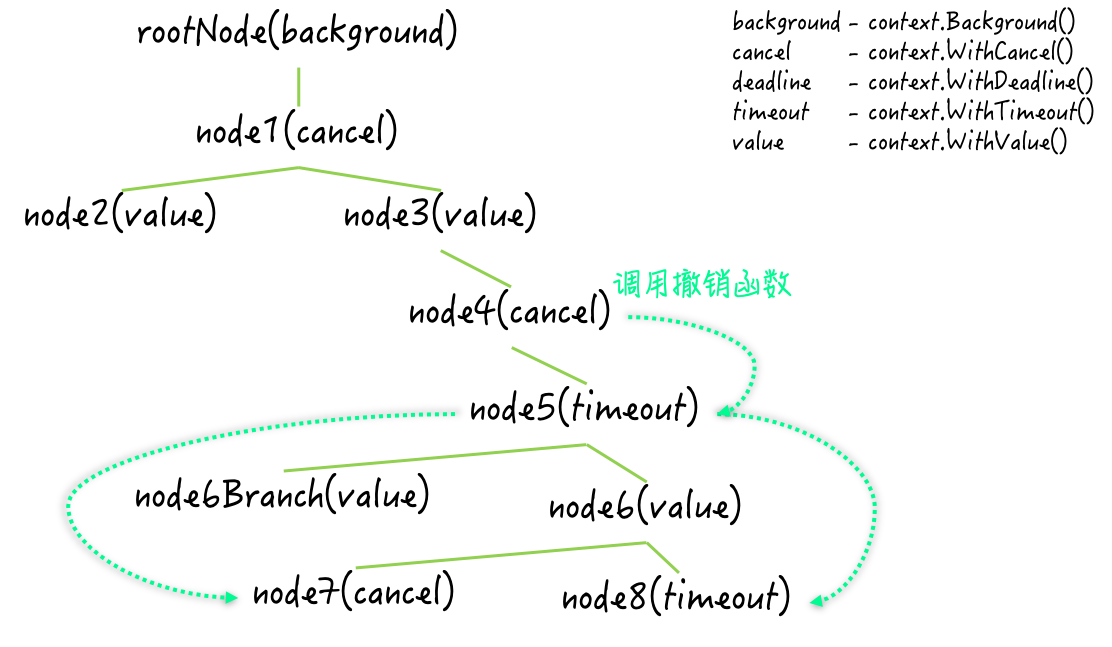 除此之外,context包中还包含了四个用于繁衍Context值的函数,即:WithCancel、WithDeadline、WithTimeout和WithValue。
