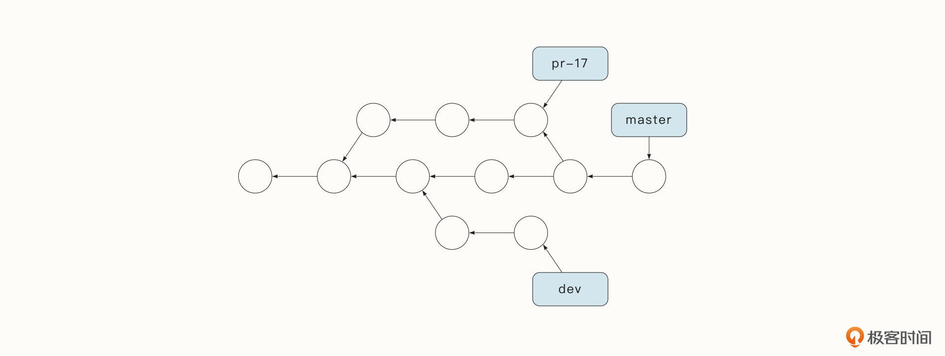对于你创建的每个分支,Git 都会跟踪该分支的一系列提交。如下图所示,当我们新提交一个commit时候,代表分支名的指针会指向新的commit,同时,新的commit会指向它的父commit,这样我们就能够追踪到整个分支的所有的commit了。如果你想更进一步地了解Git内部的一些原理,我推荐你阅读《Version Control with Git, 2nd Edition》,这本书在2022年底将会推出第三版。