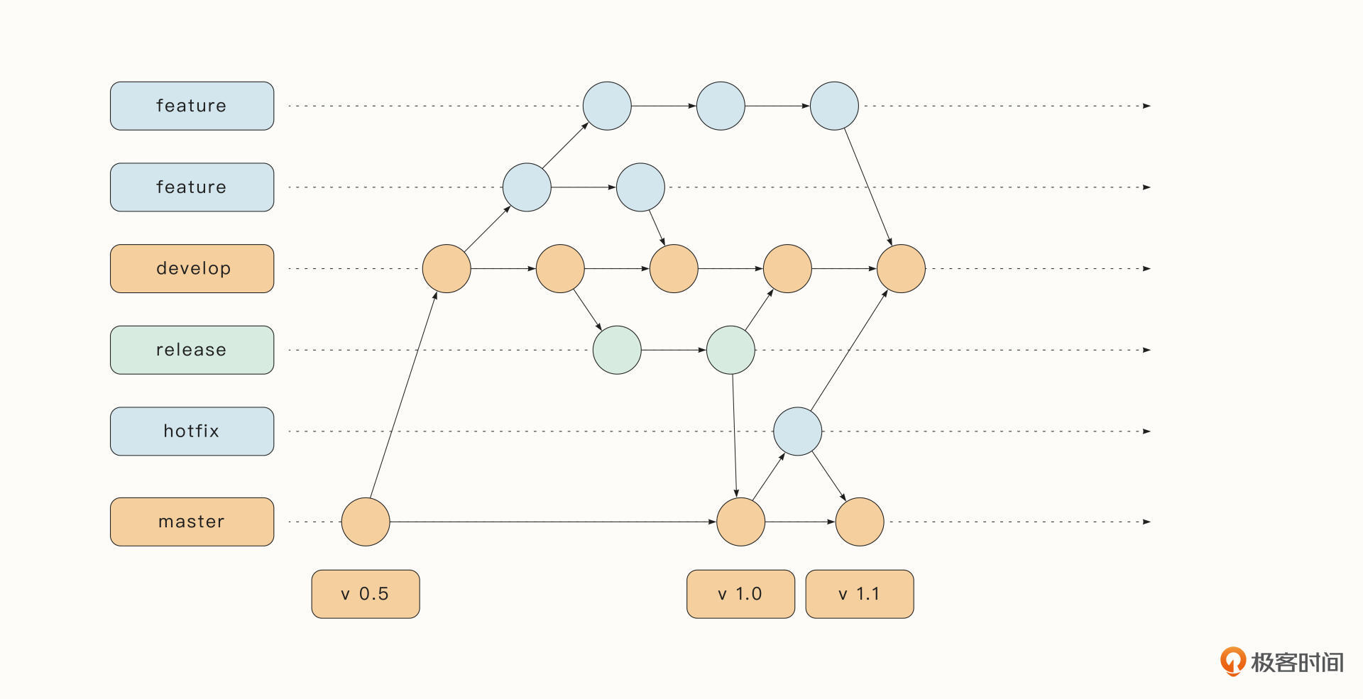 - **Release分支:**当积累了足够多的已完成特性,或者预定的系统发布周期临近的时候,我们就会从Develop分支创建出一个Release分支,专门做和当前版本发布有关的工作。Release分支一旦创建,就不允许再有新的特性被加入到这个分支了,只有修复Bug或者编辑文档之类的工作才能够进入该分支。Release分支上的内容最终会被合并到Master分支。