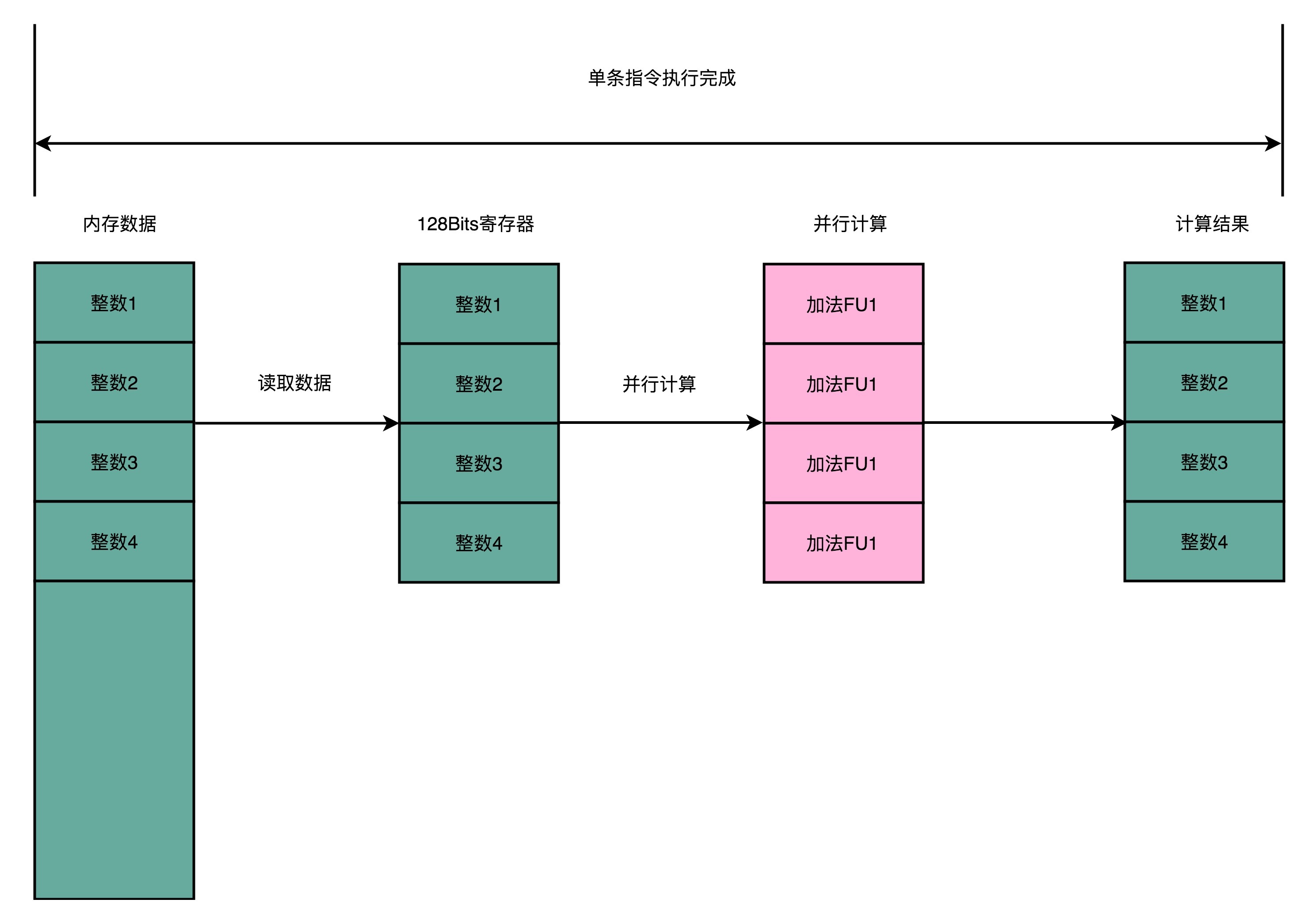为什么SIMD指令能快那么多呢?这是因为,SIMD在获取数据和执行指令的时候,都做到了并行。一方面,在从内存里面读取数据的时候,SIMD是一次性读取多个数据。