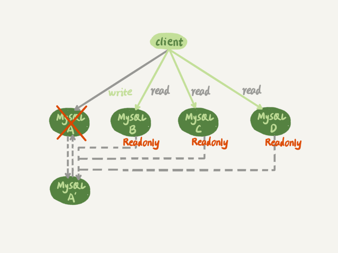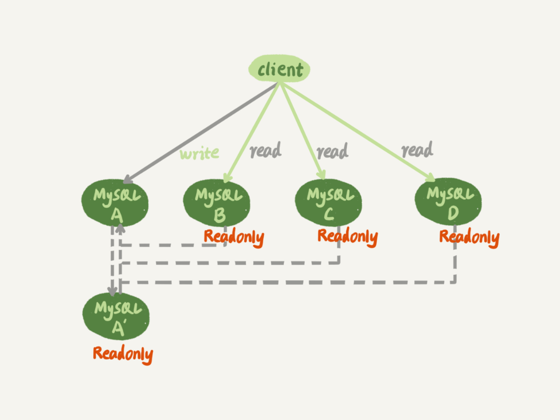 图中,虚线箭头表示的是主备关系,也就是A和A’互为主备, 从库B、C、D指向的是主库A。一主多从的设置,一般用于读写分离,主库负责所有的写入和一部分读,其他的读请求则由从库分担。