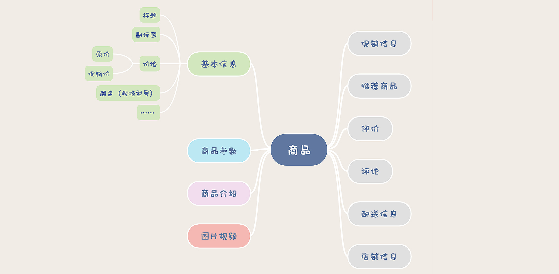 先来看一下,一个商详页都有哪些信息需要保存。我把一个商详页里面的所有信息总结了一下,放在下面这张思维导图里面。