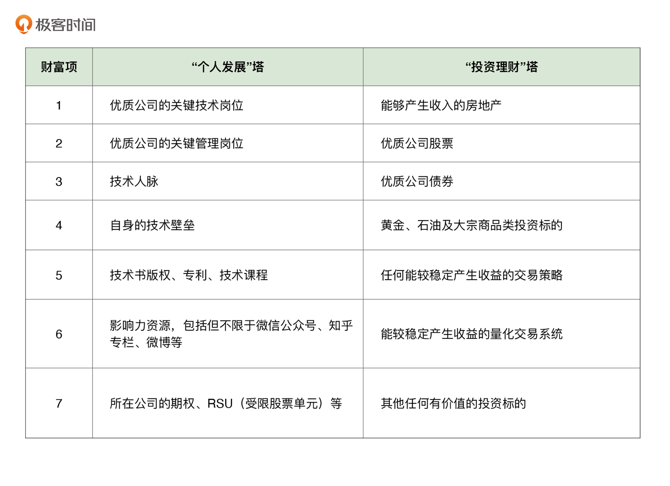 其实,作为一名程序员,我们是比其他职业的人更幸运的,因为我们可以积累的财富远不止上面提到的几项,我们的财富双塔能够装下更多的宝藏。我在下面的表格中,为“个人发展”塔和“投资理财”塔各列了七个典型的财富项,供你参考。
