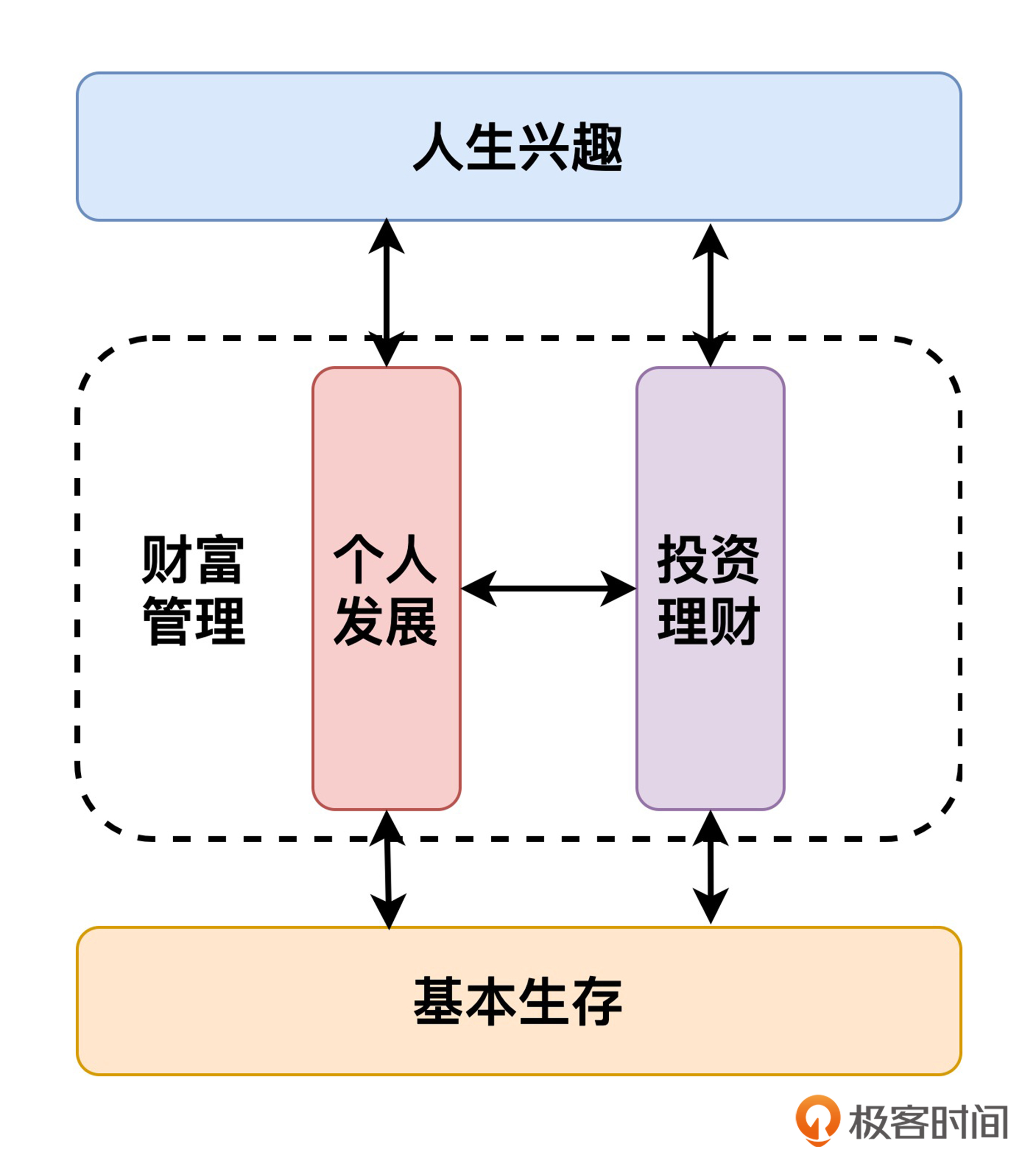 在开篇词中我提到过,我们的课程是讲给普通人听的。对于我们普通人来说,我们这一生主要会面对四个课题,分别是“基本生存”“个人发展”“投资理财”“人生兴趣”。其中,“基本生存”是地,“人生兴趣”是天,在这天地之间,“个人发展”和“投资理财”就是支撑起天地的两座高塔。我在开头提到的财富双塔框架,就是指由“个人发展”塔和“投资理财”塔组成的稳固的财富结构。