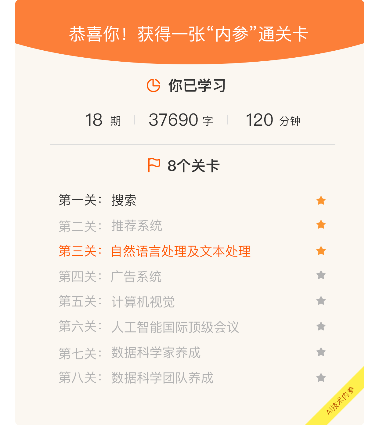 最后,恭喜你在这个模块中已经阅读了37690字,听了120分钟的音频,获得一张新的通关卡,这是一个不小的成就。在人工智能领域的千里之行,我们又往前迈出了一步。