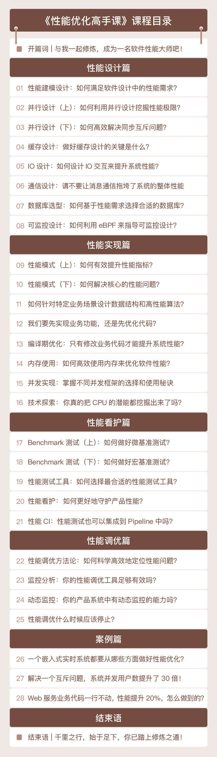 我把课程主体划分为了五大模块,分别针对基于性能的建模与设计、高性能的编码实现、性能看护和性能持续调优四个部分进行方法与实践的讲解介绍,让你能够明确地理解和掌握系统级的性能优化的理念和方法,最后还会通过一个案例模块,来帮助你提升具体实施性能优化方法的能力。