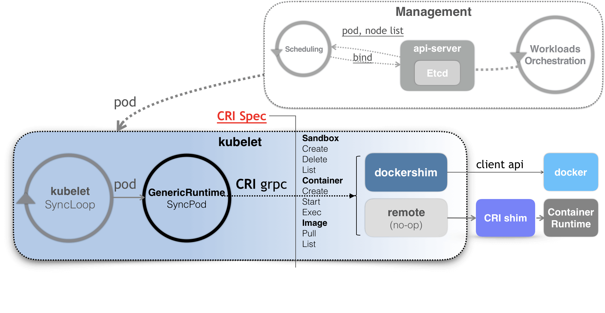 可以看到,当 Kubernetes 通过编排能力创建了一个 Pod 之后,调度器会为这个 Pod 选择一个具体的节点来运行。这时候,kubelet 当然就会通过前面讲解过的 SyncLoop 来判断需要执行的具体操作,比如创建一个Pod。那么此时,kubelet 实际上就会调用一个叫作 GenericRuntime 的通用组件来发起创建 Pod 的 CRI 请求。