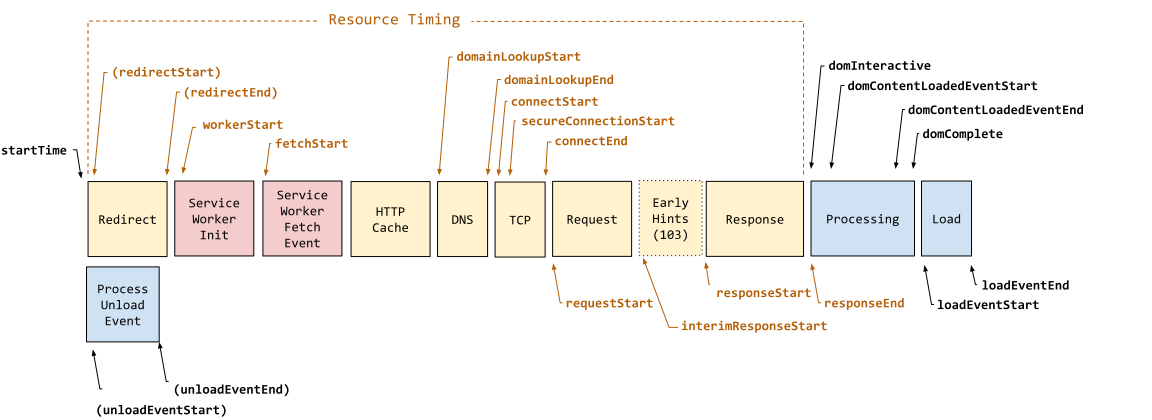 你可以看下下面这张图,Performance接口记录了一次网页加载全过程中每个生命周期的指标。这些指标,都是以时间戳来表达每个生命周期的时间位置的。