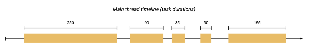 上图一共有5个任务,其中第一个任务运行时间为250ms,如果按50ms的标准去衡量,这就是一个长任务,最终这个任务的阻塞时间就是200ms(阻塞时间=250ms-50ms)。最终的TBT时间是取5个任务减去50ms后的时间的总和。