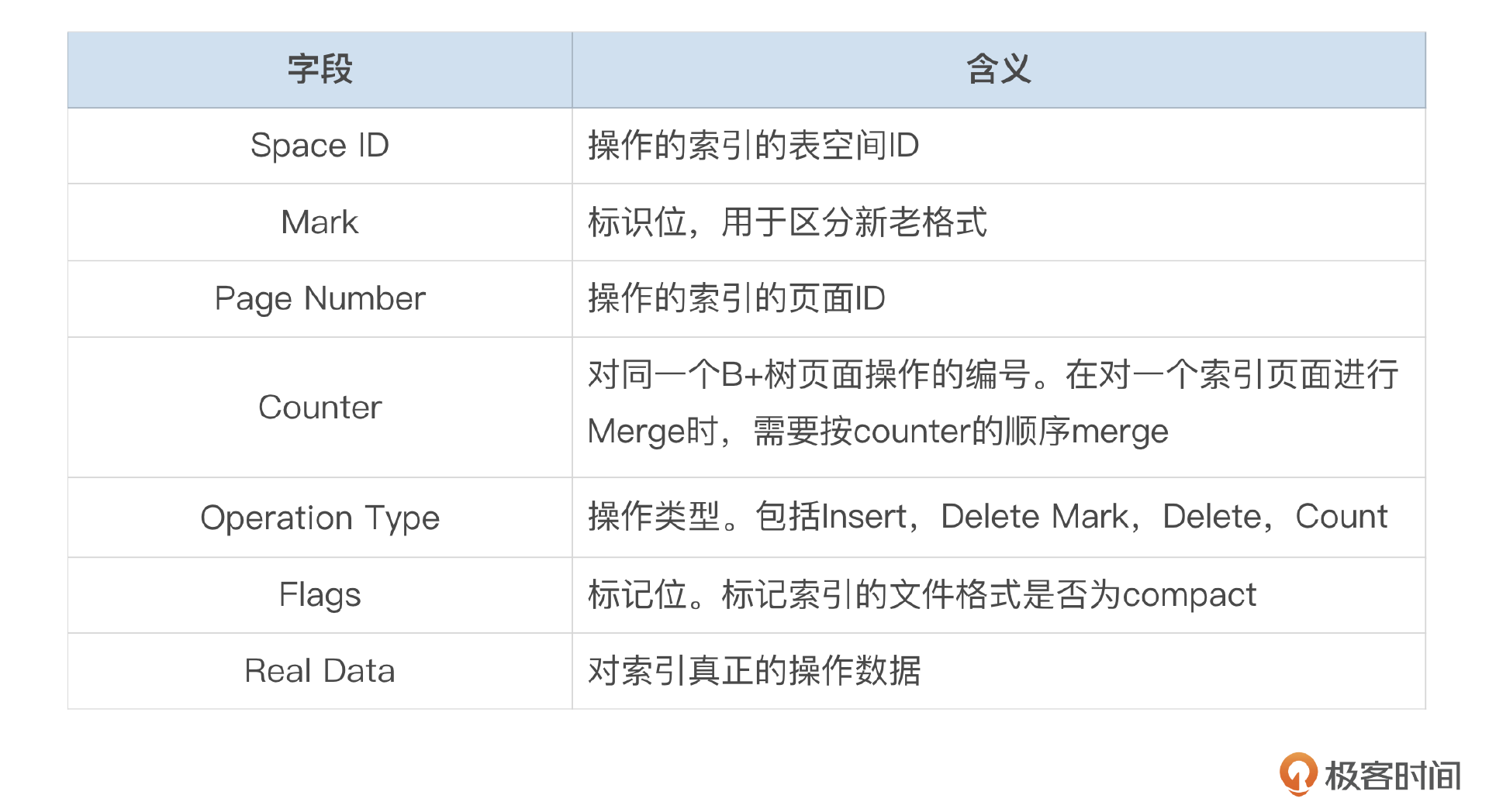 Change Buffer本身是一个B+树,存储在系统表空间中。Change Buffer中记录的格式我整理到了下面这个表格中。