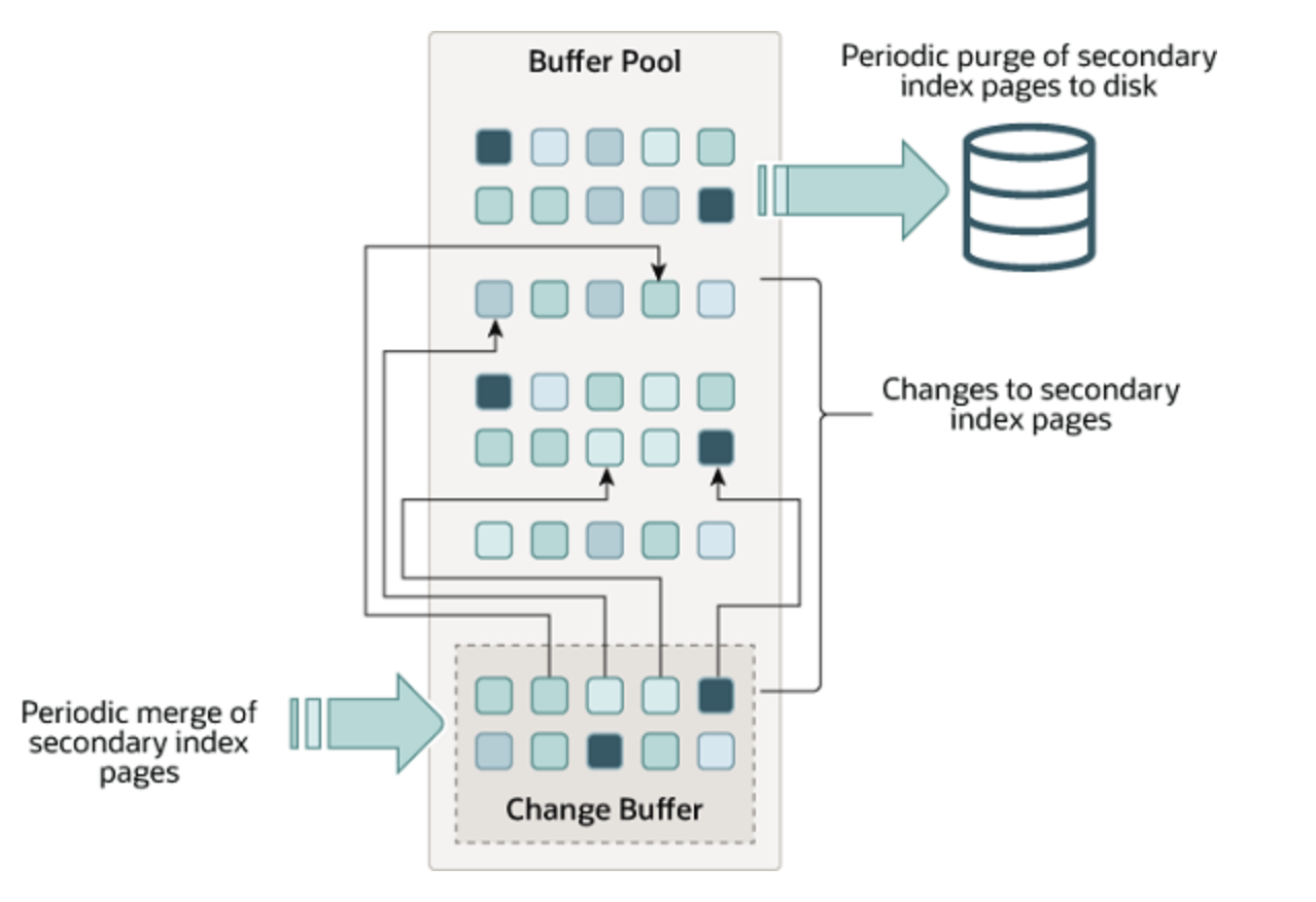 数据写入到非唯一的二级索引时,如果对应的索引页面还没有缓存在Buffer Pool中,正常情况下需要发起IO操作,将索引页面加载到buffer pool中,而IO操作通常比内存操作慢几个数量级。为了优化数据写入的性能,InnoDB使用了change buffer。在执行DML时,如果二级索引的页面还没有缓存,InnoDB会尝试先将写入操作缓存到change buffer中。在合适的时机(比如其他查询语句将页面加载到buffer pool时),innodb再将该页面缓存在change buffer中的操作合并到页面中,以此来减少数据库随机IO的数量。