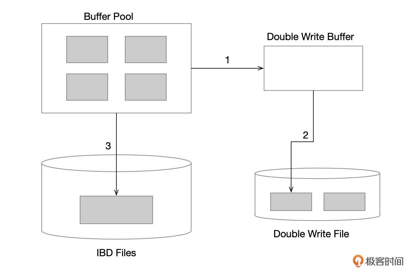 为了避免出现这种情况,InnoDB使用了Double Write Buffer。脏页刷新时,先写到Double Write Buffer,然后再将Double Write Buffer中的页面批量刷新到Double Write文件中,如果这个过程失败了,那么数据文件中的页面还是好的。如果写Double Write文件成功了,但是后续在写数据文件时失败了,那么就可以用Double Write文件中的内容来恢复数据。