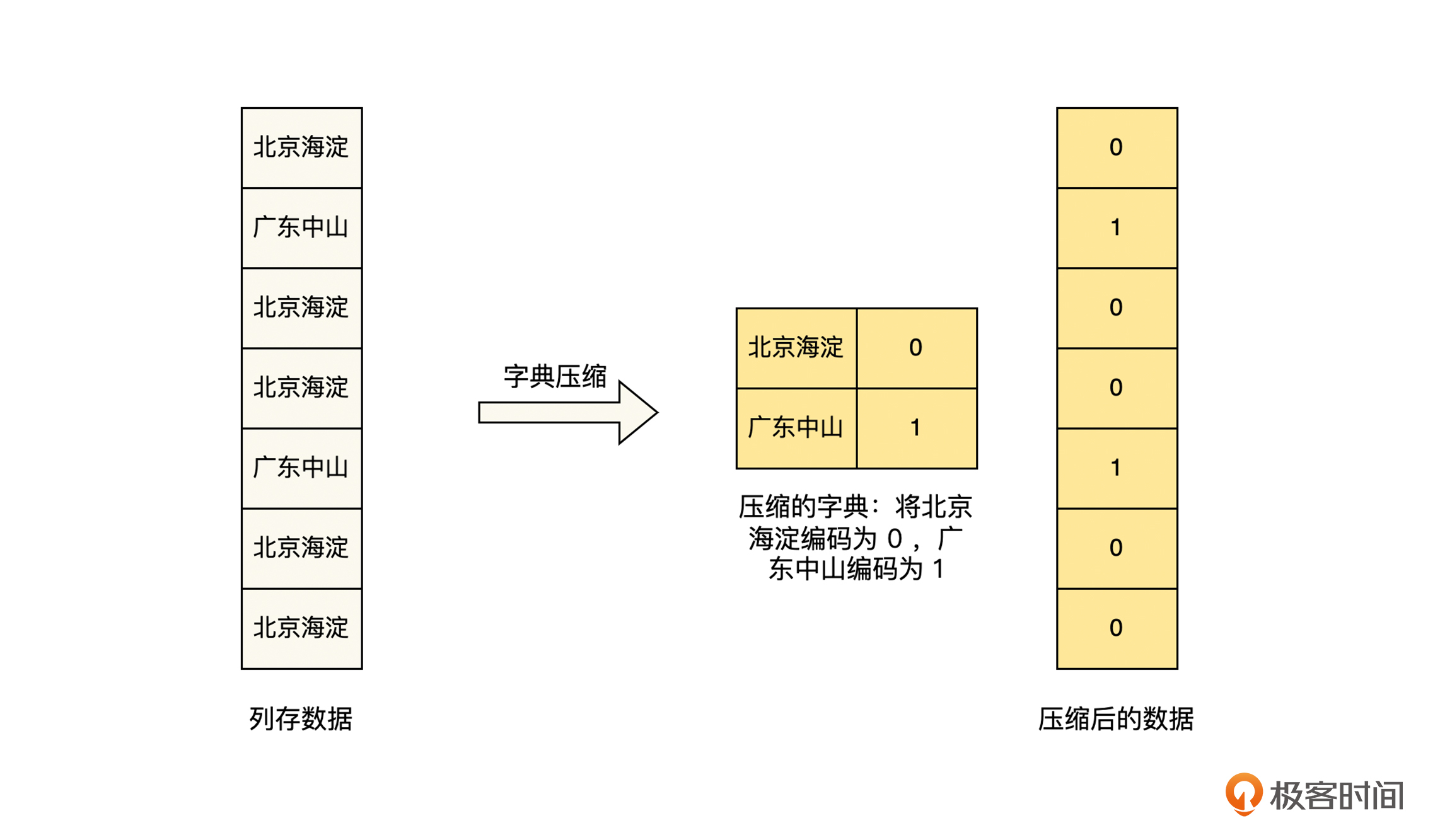 这里我们介绍一下字典压缩算法,其他的算法也是类似的思路,就不再一一介绍了。字典压缩算法的思路是,在数据重复度比较高的情况下,对数据采用字典重新编码,来减少数据的大小,具体见下图。