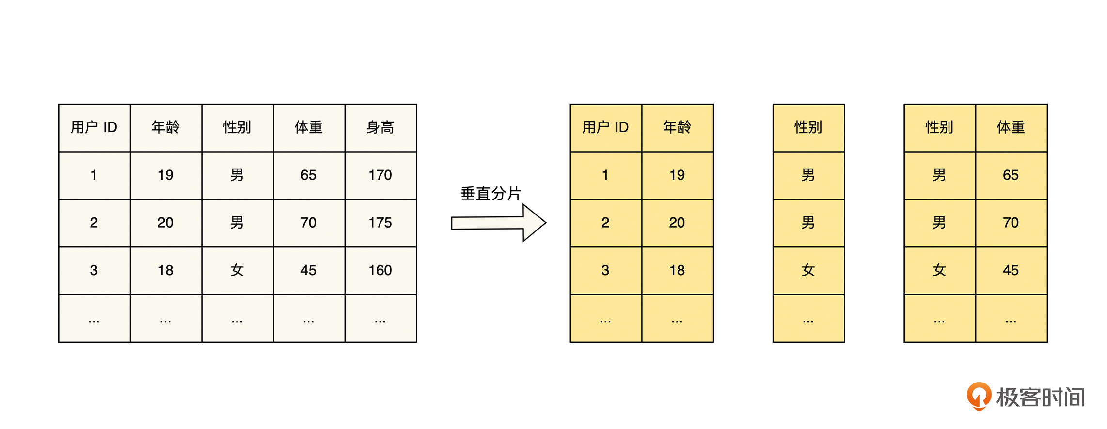 垂直分片策略和水平分片策略都是对数据进行分片,但是它们的思路却截然不同。水平分片策略将整个数据集的条数作为划分的对象,每一个分片负责处理一定的数据条数。而垂直分片策略则是将数据 Schema 的字段集个数作为划分的对象,每一个分片负责处理一个或几个字段的全部数据,具体如下图所示。
