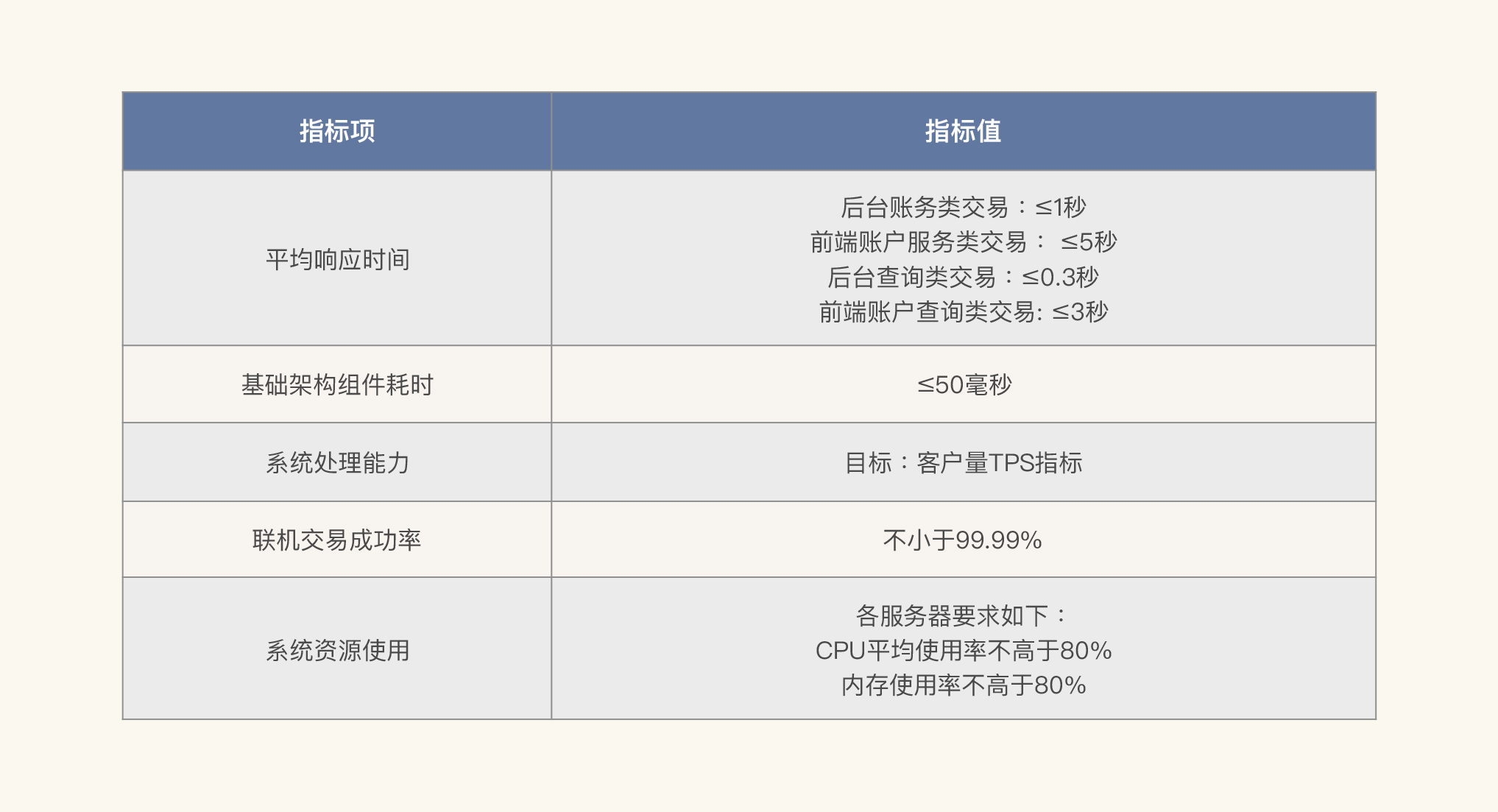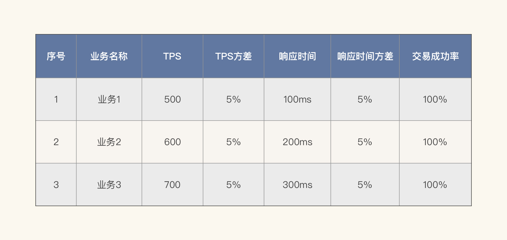 我们先说下业务需求指标。我们可以列这样一个单业务性能指标的表格。
