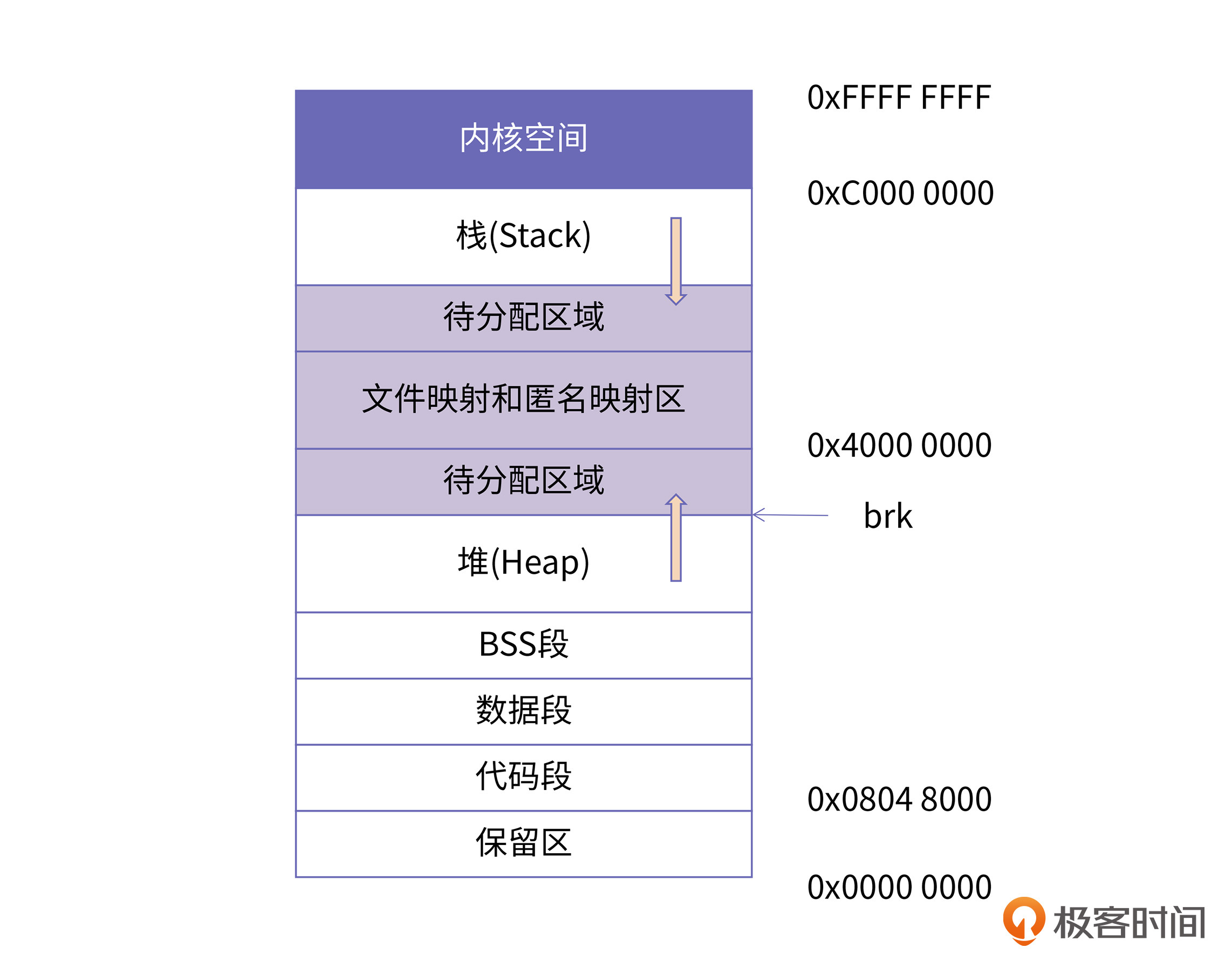 对此,我们可以想象堆和栈分别由两个指针控制,堆指针指明了当前堆空间的边界,栈指针指明了当前栈空间的边界。当堆申请新的内存空间时,只需要将堆指针增加对应的大小,回收地址时减少对应的大小即可。而栈的申请刚好相反。这其实就是内核对堆跟栈使用的最根本的方式,其中,堆的指针叫做“Program break”,栈的指针叫做“Stack pointer”,也就是x86架构下的sp寄存器。我们在后续的课程中会分别展开堆空间跟栈空间的实现原理。