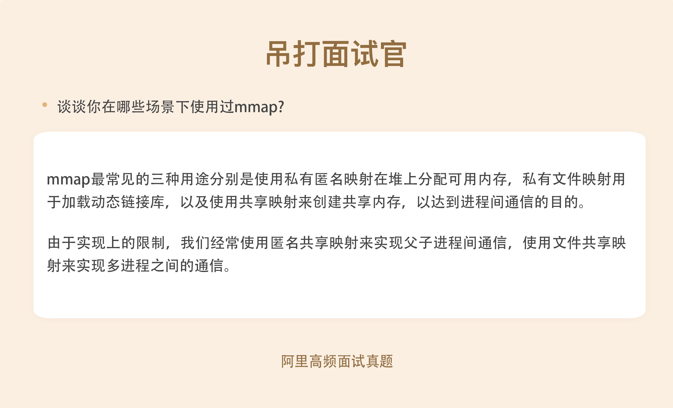 mmap这个系统调用的能力非常强大,我们在后面还会经常遇到它。在这节课里,我们先来了解一下它最常见的用法。