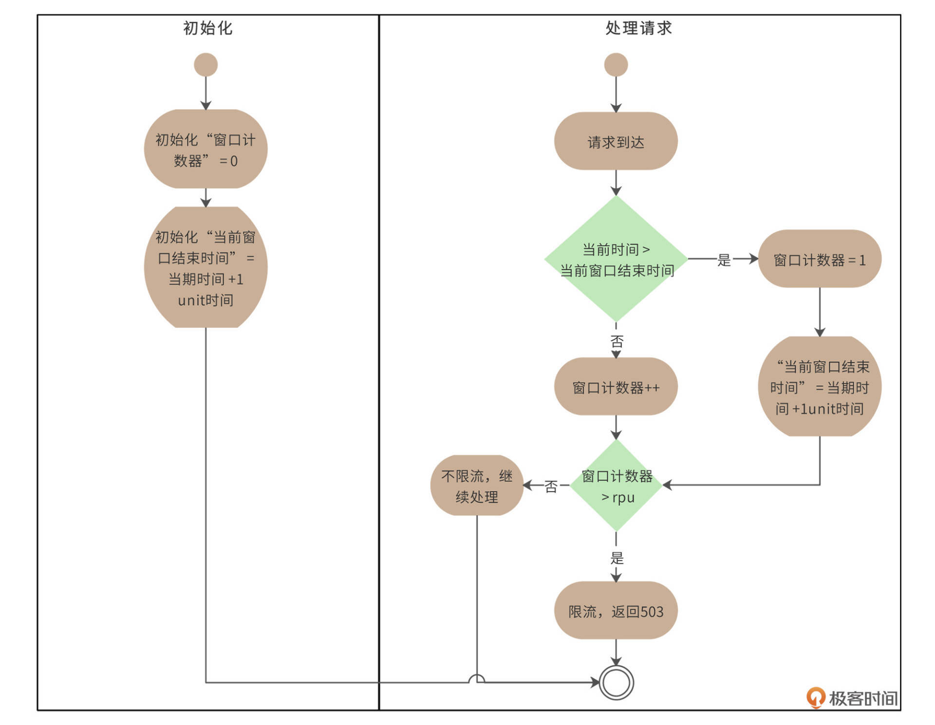 上图包括“初始化”和“处理流程”两个泳道。初始化的时候,设置“窗口计数器”和“当前窗口结束时间”两个变量。处理请求的时候,判断当前时间是否大于“当前窗口结束时间”,如果大于,那么重置“窗口计数器”和“当前窗口结束时间”两个变量;如果没有,窗口计数器+1,并判断计数器是否大于配置的限流请求数rpu,根据结果决定是否进行限流。