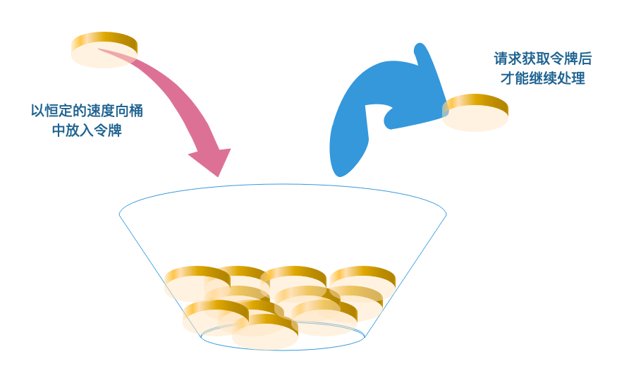 令牌桶是另一种桶限流算法,模拟一个特定大小的桶,然后向桶中以特定的速度放入令牌(token),请求到达后,必须从桶中取出一个令牌才能继续处理。如果桶中已经没有令牌了,那么当前请求就被限流,返回503响应。如果桶中的令牌放满了,令牌桶也会溢出。