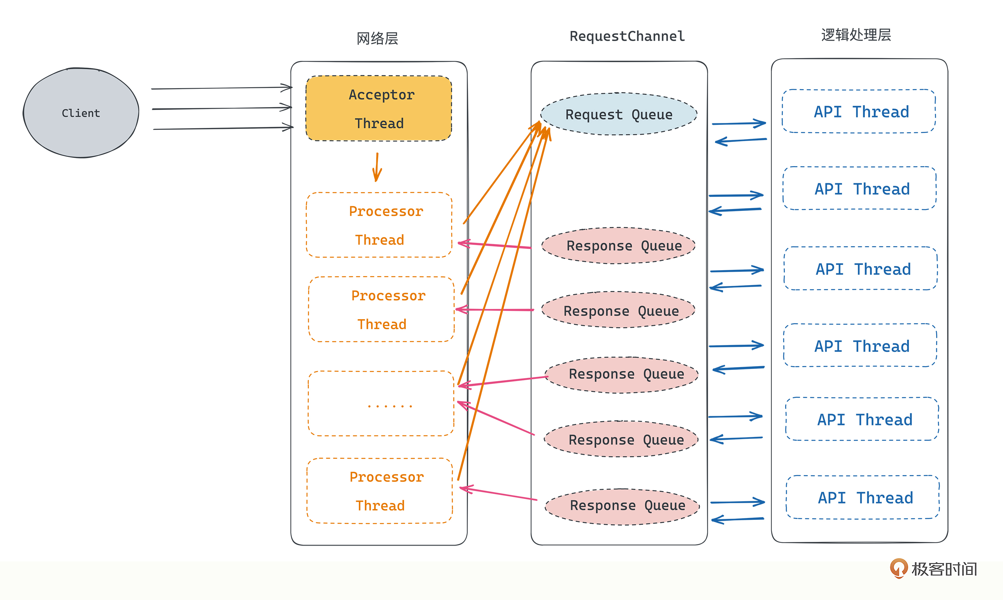 看整个网络层的结构图。Processor线程和Handler线程之间通过RequestChannel传递数据,RequestChannel中包含一个RequestQueue队列和多个ResponseQueues队列。每个Processor线程对应一个ResponseQueue。