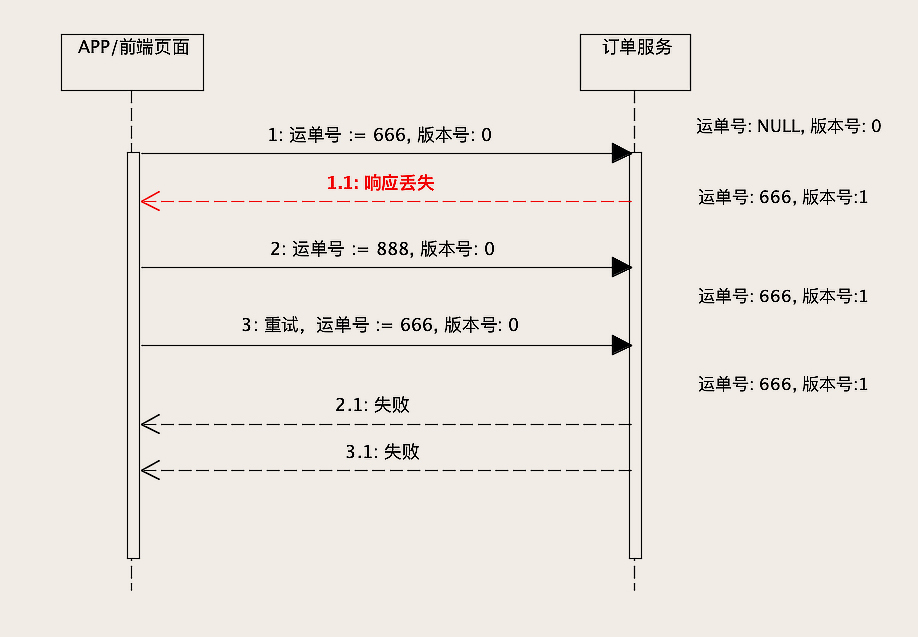 - 第一种情况,把运单号更新为666的操作成功了,更新为888的请求带着旧版本号,那就会更新失败,页面提示用户更新888失败。