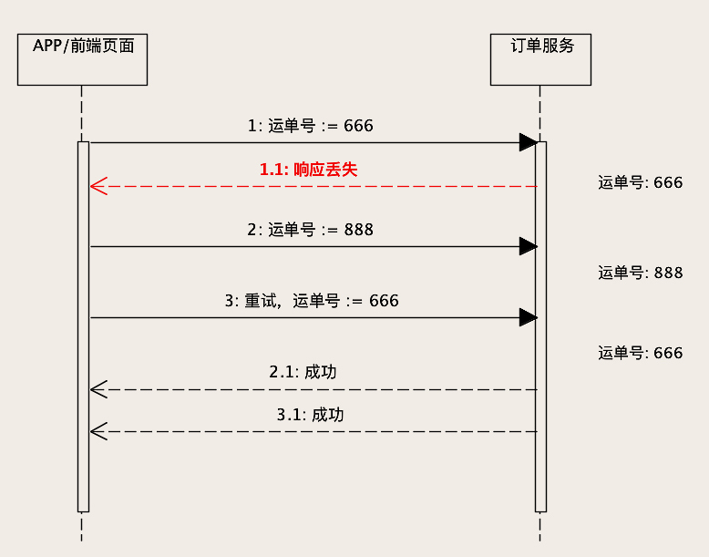 有的同学会说,前端页面上应该防止用户重复提交表单,你说的没错。但是,网络错误会导致重传,很多RPC框架、网关都会有自动重试机制,所以对于订单服务来说,重复请求这个事儿,你是没办法完全避免的。
