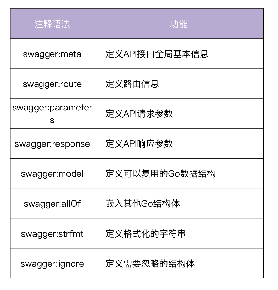 go-swagger通过解析源码中的注释来生成Swagger文档,go-swagger的详细注释语法可参考官方文档。常用的有如下几类注释语法: