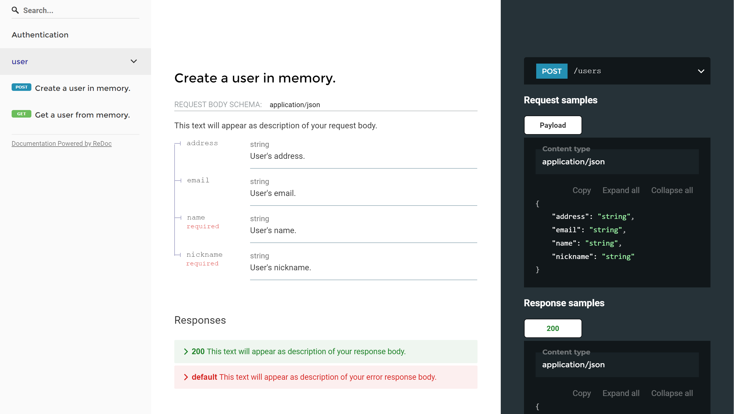 - 每个API上可用的路径(/users)和操作(GET /users,POST /users)。