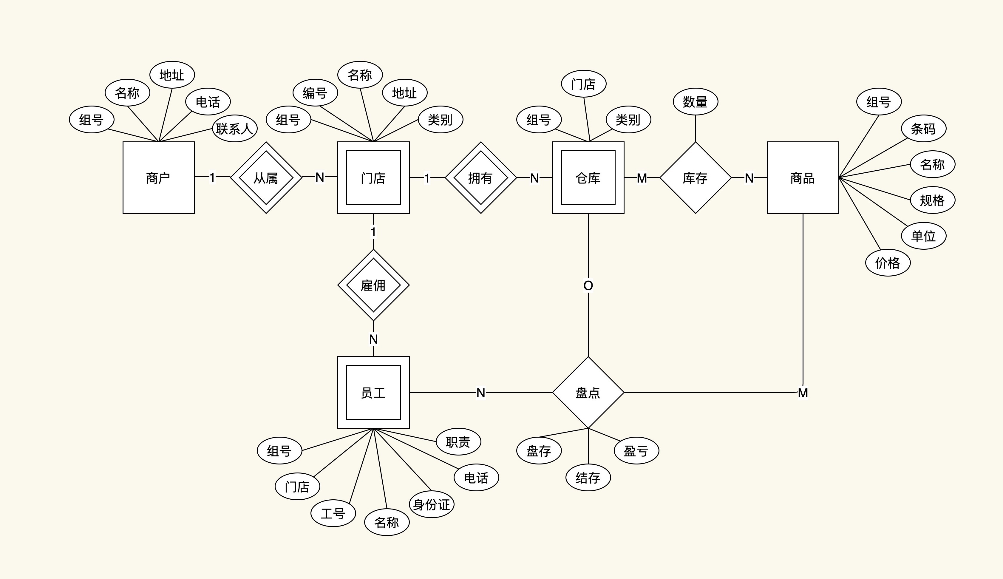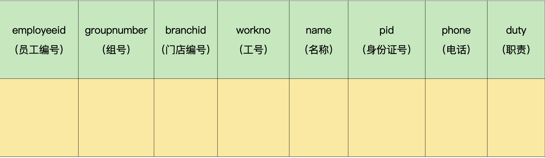 - 员工:组号、门店编号、工号、名称、身份证、电话、职责。