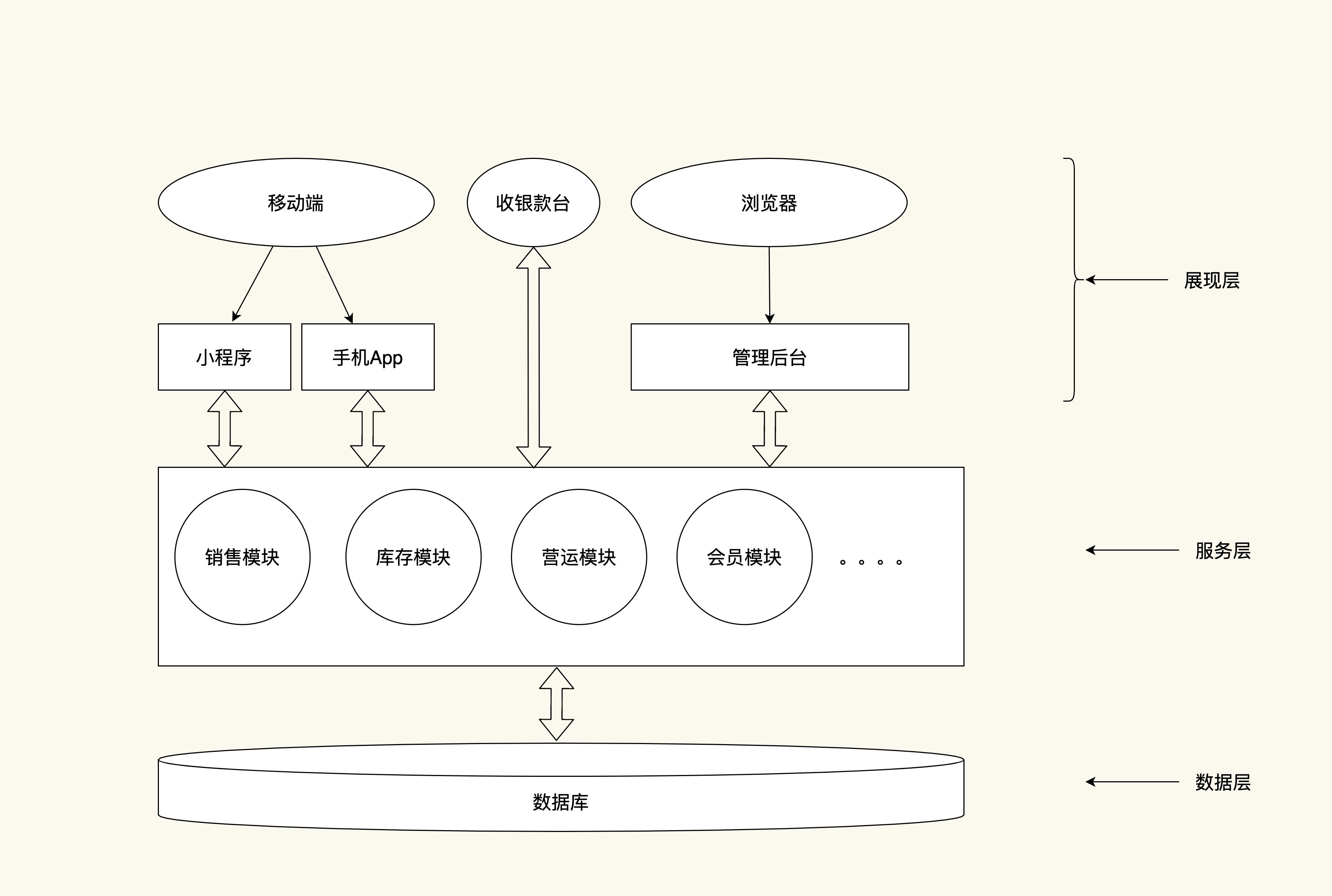 - 展现层:包括门店收款机App、移动端的手机App、小程序,以及通过浏览器访问的后台管理部分。