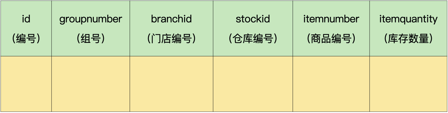 - 仓库:组号、门店编号、仓库编号、类别。