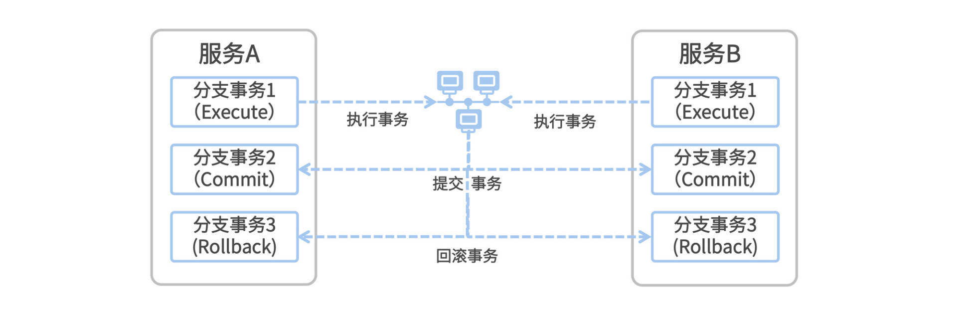 我们可以把执行事务、提交事务和回滚事务放到三个不同的分支事务中,其中每一个分支事务都是一个独立的Transaction,一个分支事务执行完毕就会迅速释放掉数据库连接资源。这样一来,原本横跨Execute-Commit-Rollback的一个长事务,就被拆分成了三个独立的分支事务。