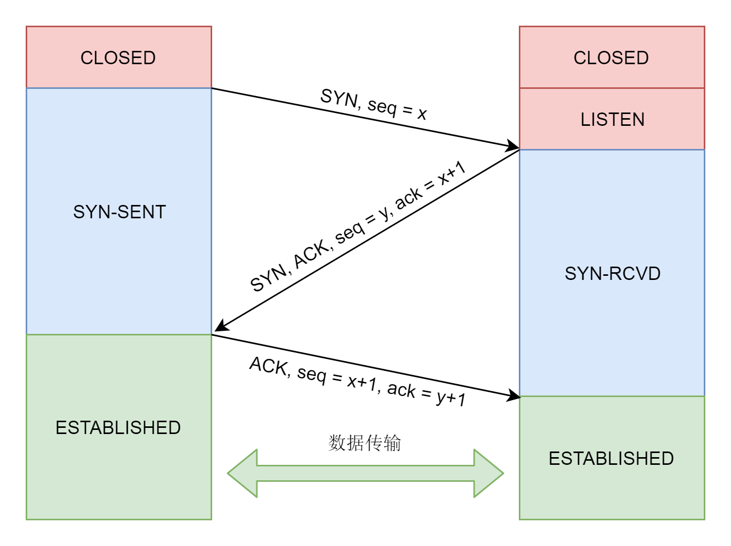 接下来,就要建立TCP的连接了,也就是著名的三次握手,其实就是将客户端和服务端的状态通过三次网络交互,达到初始状态是协同的状态。下图就是三次握手的序列图以及对应的状态转换。