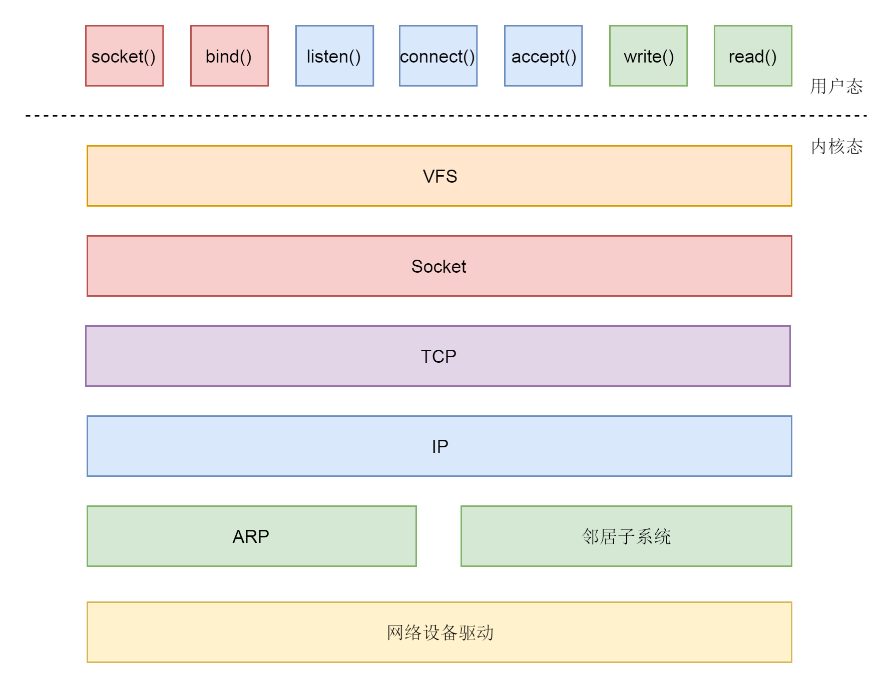 通过学习,我们知道,socket系统调用是用户态和内核态的接口,网络协议的四层以下都是在内核中的。很多的书籍会讲如何开发一个高性能的socket程序,但是这不是我们这门课的重点,所以我们主要看内核里面的机制就行了。