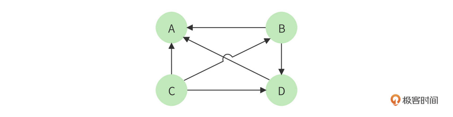 以下面四个网页A、B、C、D举例,带箭头的线条表示链接。