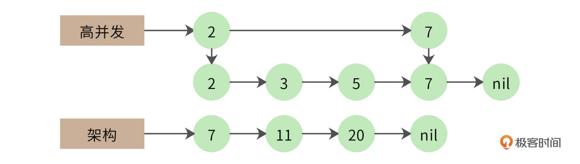 第一个链表遍历到自己的最后一个元素,才和第二个链表的第一个元素相同。那么第一个链表能不能跳过前面那些元素呢?很自然,我们想到可以用跳表来实现,如下图。