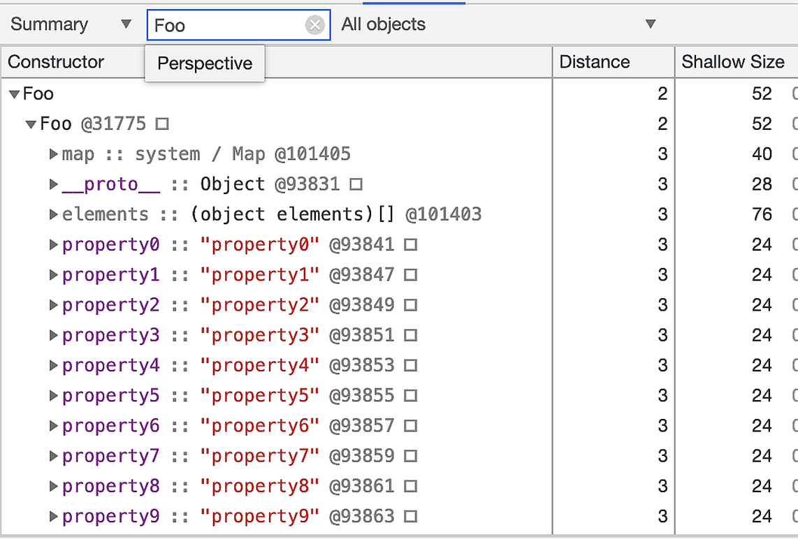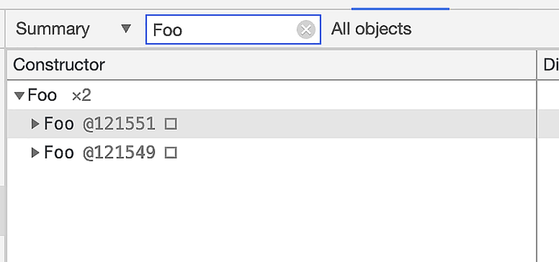 上图就是收集了当前内存快照的界面,要想查找我们刚才创建的对象,你可以在搜索框里面输入构造函数Foo,Chrome会列出所有经过构造函数Foo创建的对象,如下图所示: