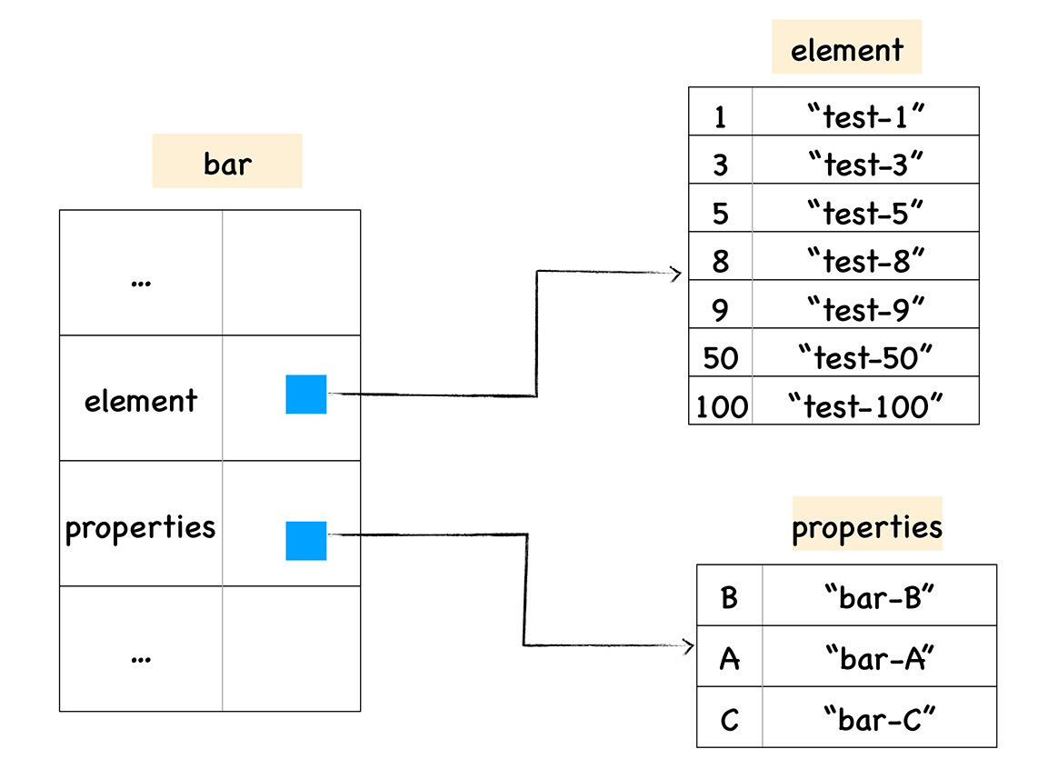 通过上图我们可以发现,bar对象包含了两个隐藏属性:elements属性和properties属性,elements属性指向了elements对象,在elements对象中,会按照顺序存放排序属性,properties属性则指向了properties对象,在properties对象中,会按照创建时的顺序保存了常规属性。